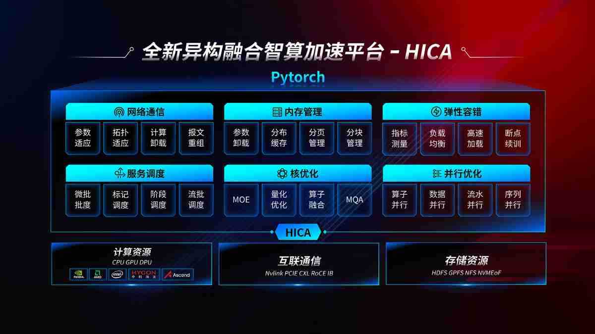通过自研的服务层、、中间适配层、、、以及调度编排算法,,,,采用数据并行、、、模型并行等多种并行方式,,,把并行计算任务进行有效的分解,,,,使其分别由相应的软件栈和算力资源来承接。。。当GPU资源变化,,,,HICA可以实时动态调度计算子任务并调整模型拓扑和架构,,以充分聚合各种算力资源。。。。