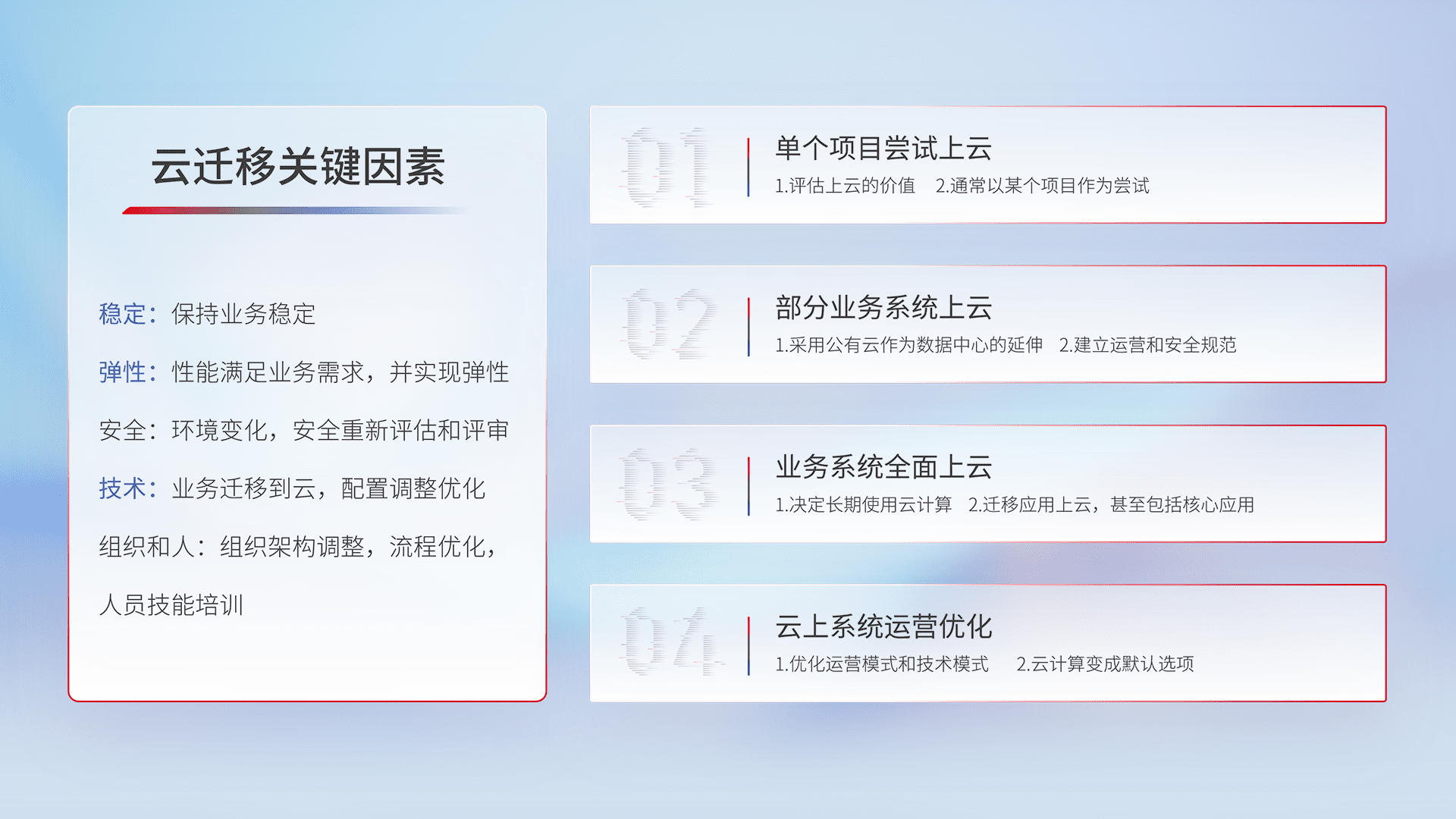 结合实际业务,,从规划设计、、云平台选型、、云原生改造、、、、数据迁移、、、、集成交付,,迁移全过程为客户识别最佳上云路径,,做好风险识别管理,,设计网络架构、、、、身份权限、、、安全审计合规、、操作审计、、、、日志审计、、监控告警策略、、多站点容灾设计等,,对云上基础设施进行整体规划,,,,提升IT治理水平,,,以满足弹性、、高可用、、、、高性能的需求。。。。