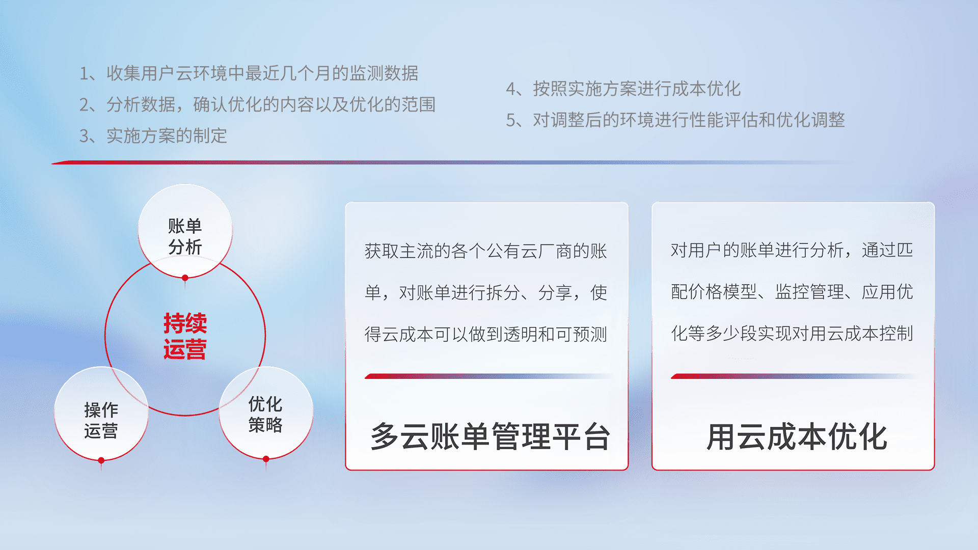 通过多云纳管,,,以统一的资源数据模型把客户的云资源进行抽象和封装,,进而实现对多云资源的统一操作,,,,保障云资源管理的可靠性、、、、稳定性与可用性。。。。量身定制化运维内容,,,,配置、、、开发运维、、补丁管理、、备份、、、监控、、、认证和访问管理、、审计和日常巡检等,,,保障在用云过程中的可靠度,,稳定度以及高可用率。。。