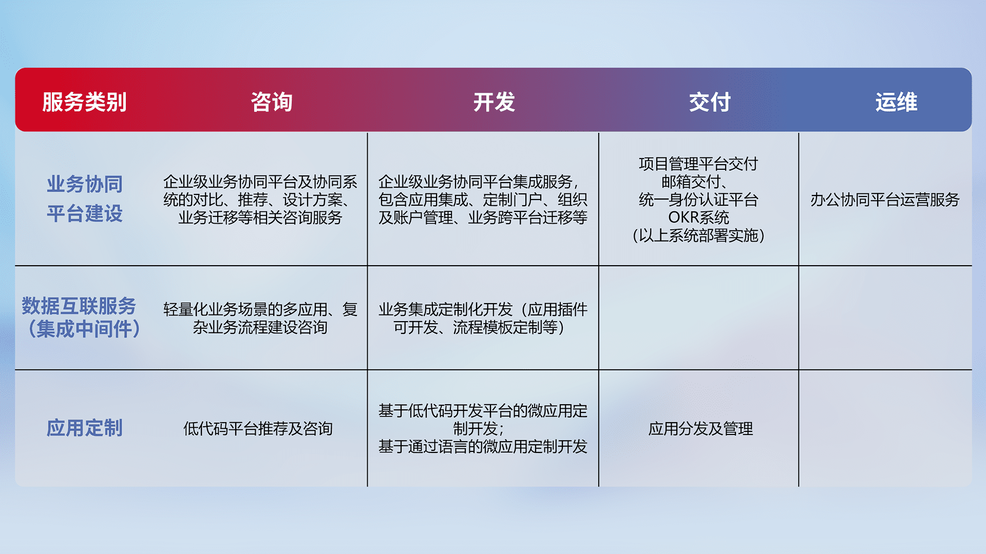 针对钉钉、、企微、、、、IDaas等平台级产品提供产品的规划、、、方案、、、交付、、、定制化开发等服务,,,实现如统一协同办公、、、、智能客户服务、、混合会议管理、、智能数据查询、、、、等业务场景,,,,实现数字化转型。。。。
